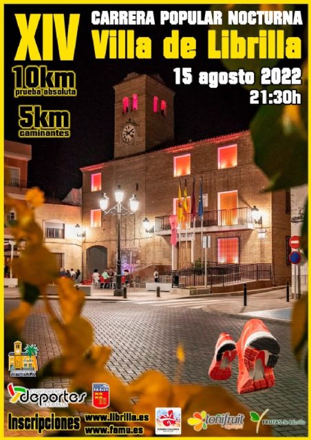 El Ayuntamiento de Librilla, en colaboración con la FAMU, organiza la XIV Carrera Popular Nocturna "Villa de Librilla", a partir de las 21:30h. con salida y meta frente al Auditorio Municipal