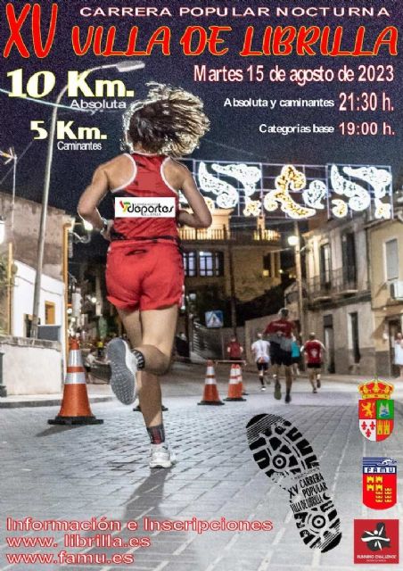 El Ayuntamiento de Librilla, en colaboración con la FAMU, organiza la XV Carrera Popular Nocturna “Villa de Librilla”, a partir de las 21:30h. con salida y meta frente al Auditorio Municipal