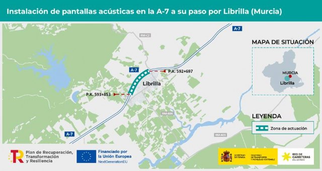 El Ministerio de Transportes y Movilidad Sostenible ha licitado por unos 2,58 millones de euros las obras para mitigar el ruido generado por el tráfico de la autovía A-7 a su paso por el municipio de Librilla, en la provincia de Murcia. El anuncio se publicará próximamente en el Boletín Oficial del Estado (BOE).